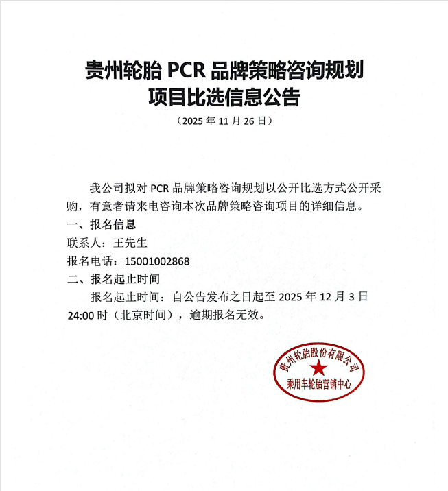贵州轮胎 PCR 品牌策略咨询规划项目比选信息公告
