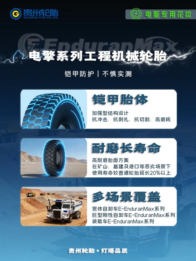 随着矿山作业智能化、绿色化加速转型,纯电动工程机械凭借低排放与高效率,正成为矿山装备升级的重要趋势。但电驱车型扭矩大、启停频繁,加之矿山路面崎岖、多风化石与煤矸石,对轮胎的耐磨、抗冲击、抗切割及耐高温性能提出更高要求。贵州轮胎深入洞察电驱工况痛点,推出电擎系列(E-EnduranMax)电驱专用花纹产品,以“铠甲防护、高效施工”为核心价值,为电动工程机械提供坚实可靠的解决方案。